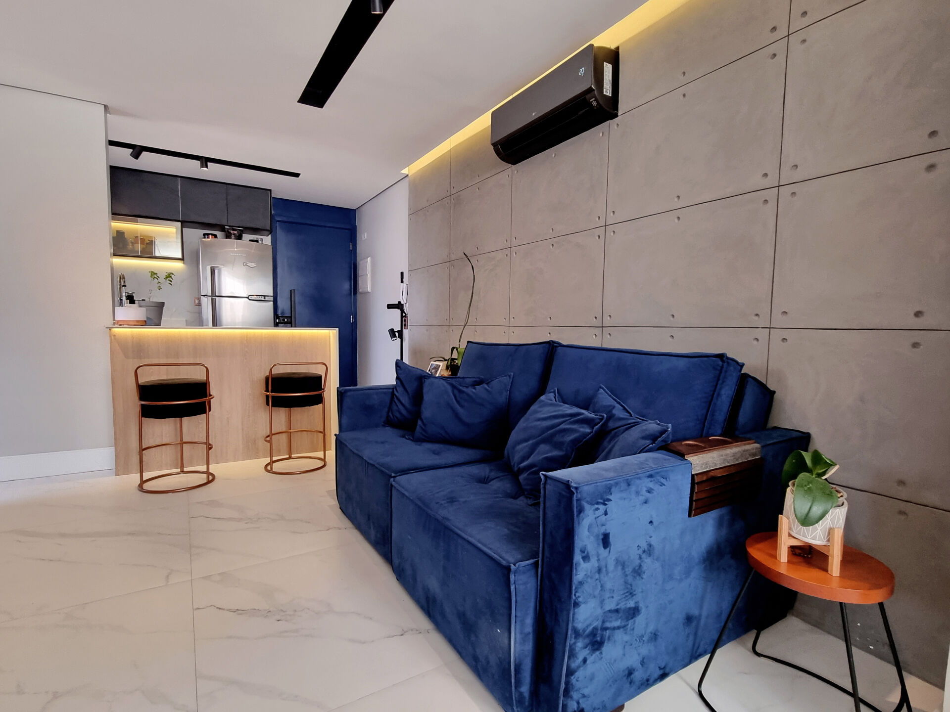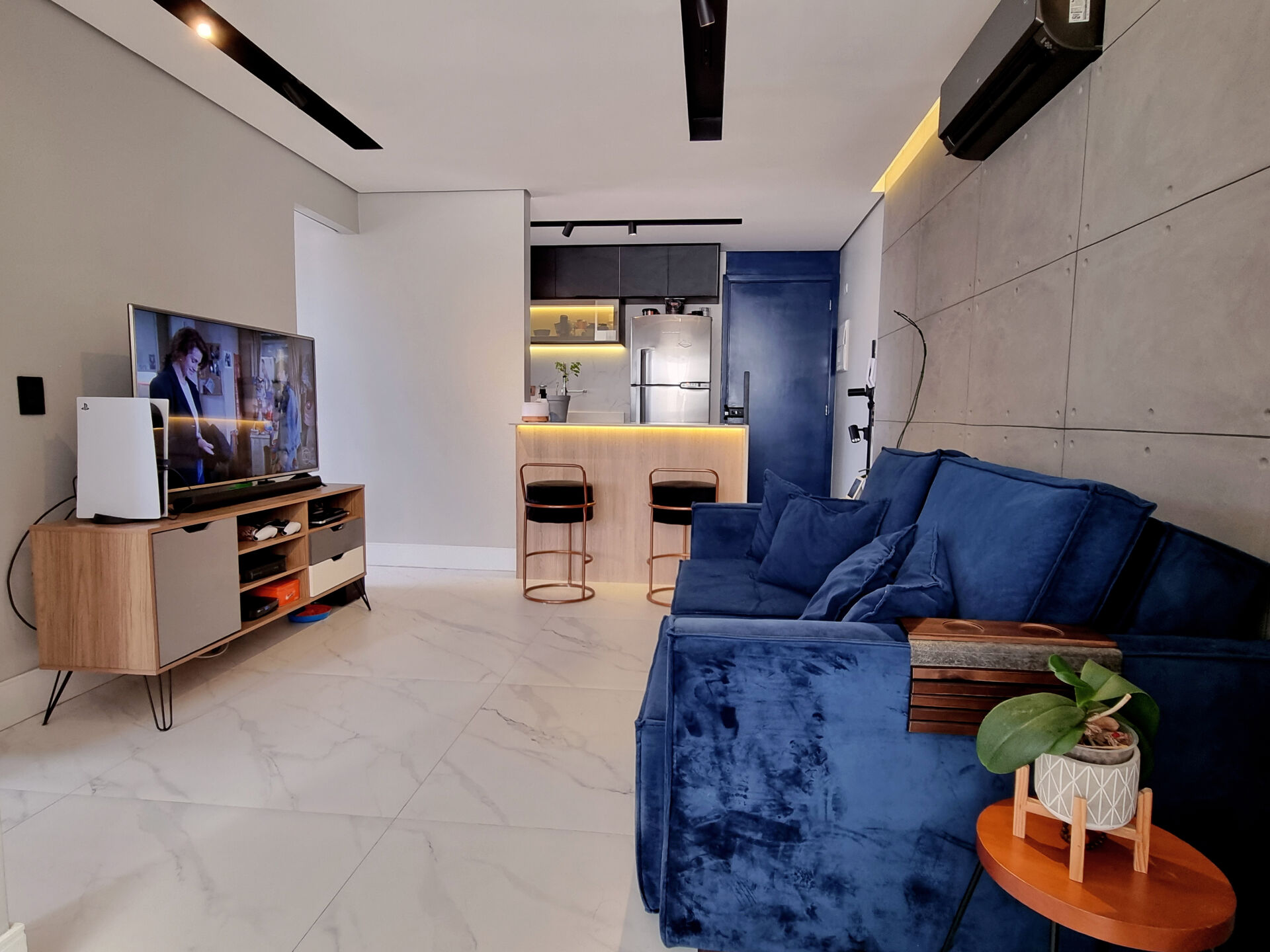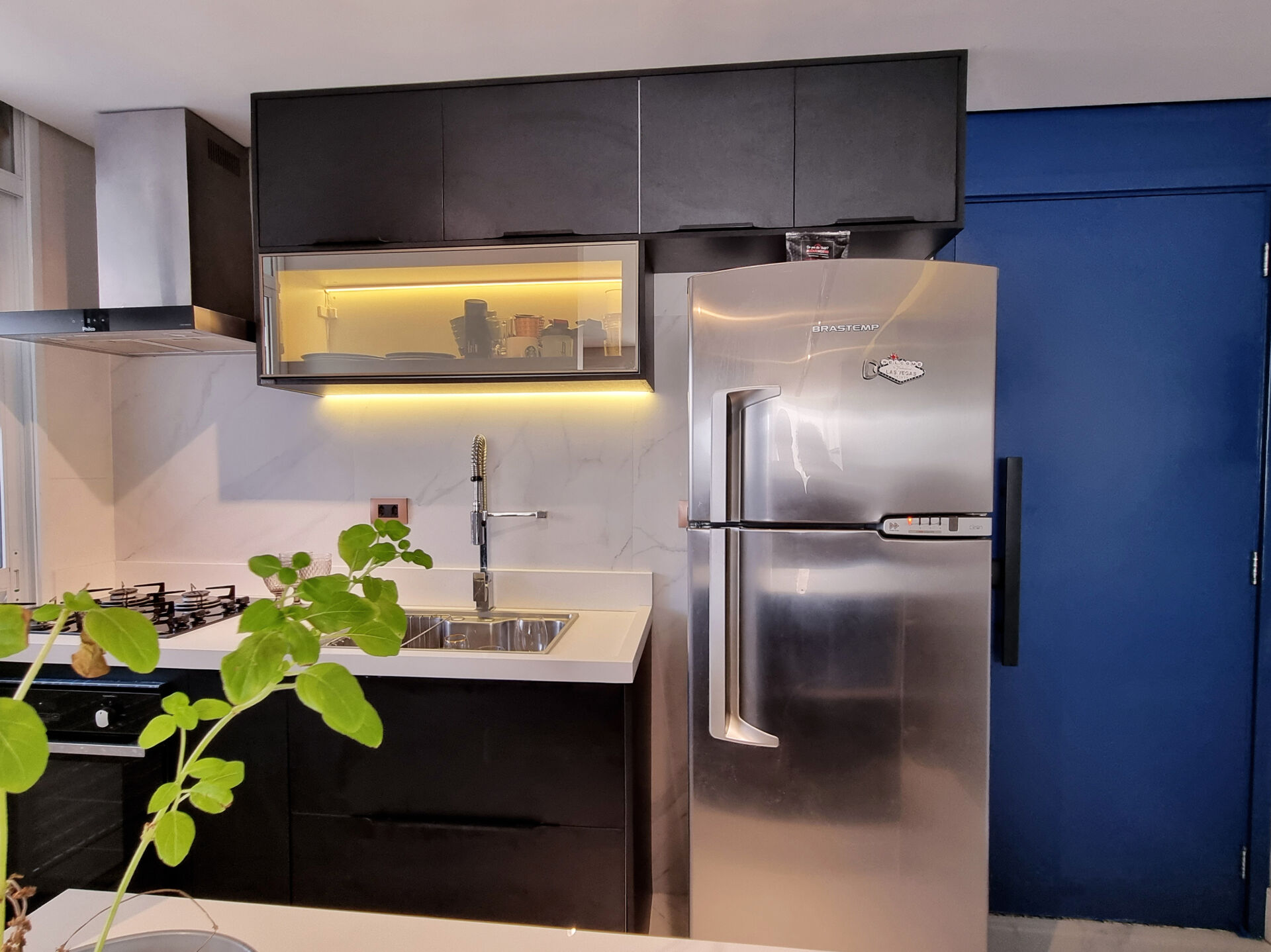 Na varanda, a porta balcão foi removida e esse espaço de 7m² foi incorporado à sala, ampliando ainda mais o ambiente. A cozinha tem bastante espaço de armazenamento, já que cada cantinho foi super bem aproveitado.